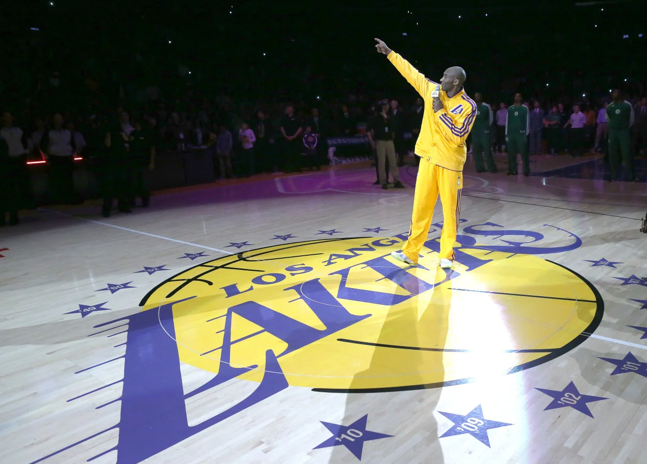 Kobe Bryant of the Los Angeles Lakers speaks in a ceremony honoring Lakers late owner Dr. Jerry Buss before the game with the Boston Celtics at Staples Center on February 20, 2013 in Los Angeles, California.