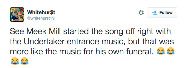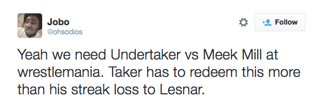July 31, 2015 Some funny tweets mentioning WWE Superstars…. Meek Mill/Undertaker edition because that diss track was so trash it’s almost offensive that he sampled Taker’s theme. Source: http://cdiddy404.tumblr.com/post/125484554...